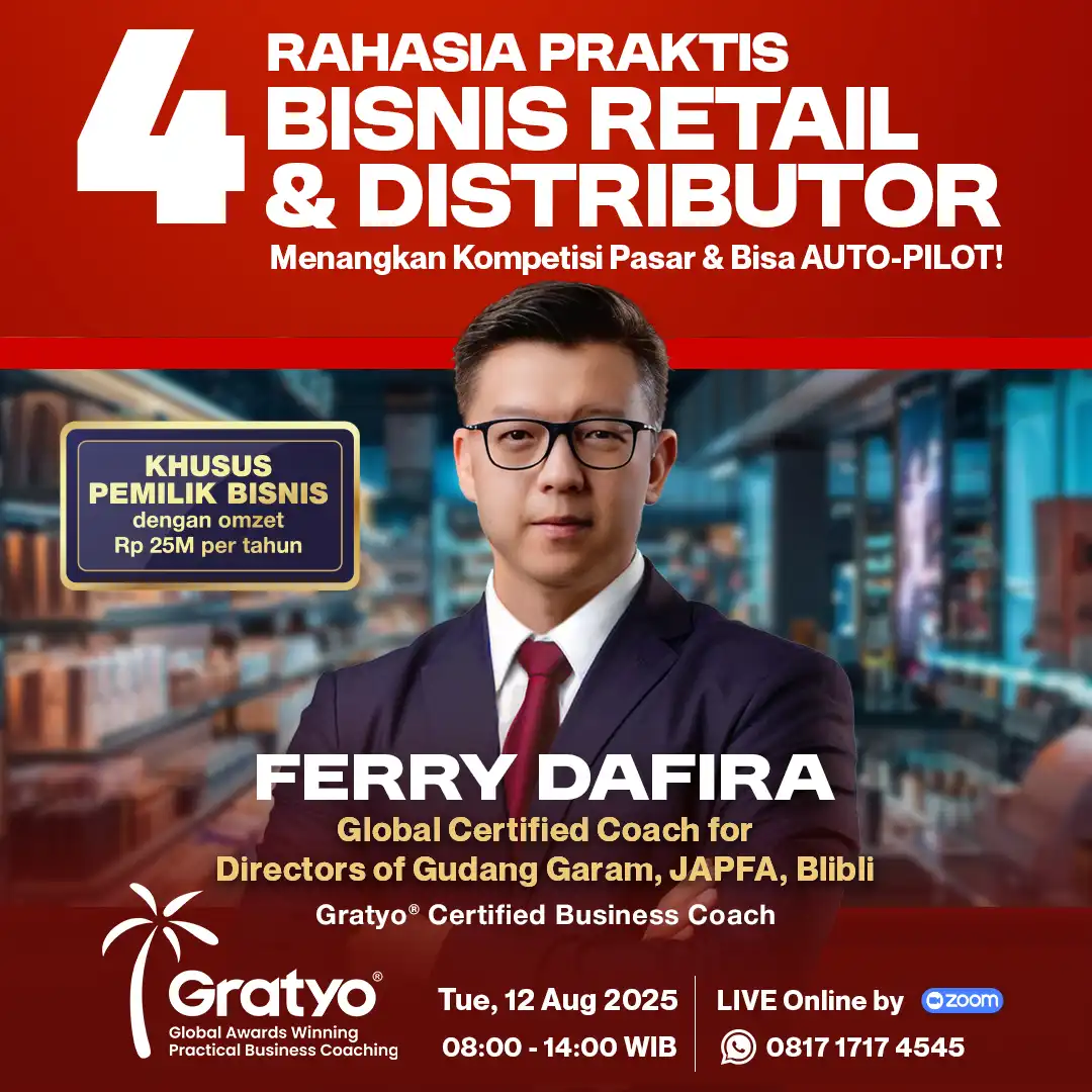 Bersama puluhan high-calibre Certified Business Coach di Gratyo® Global Awards Winning Practical Business Coaching Company berhasil membantu bisnis dengan revenue miliaran hingga triliunan rupiah go to the next level, bisa IPO, hingga bisnis Profitable & AUTO-PILOT™.